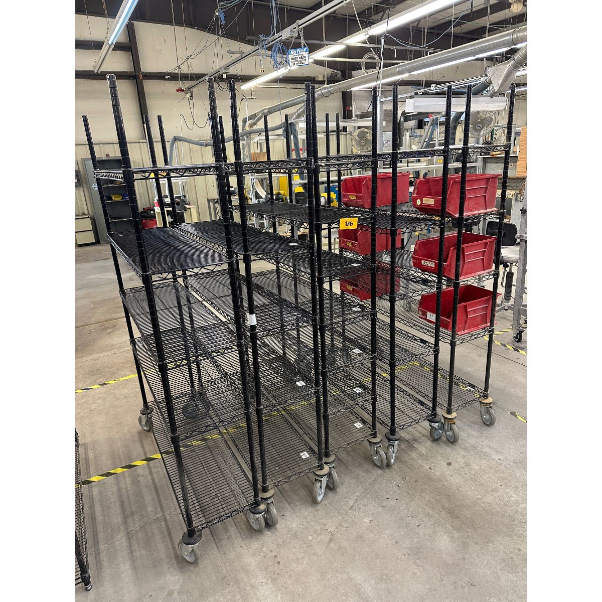 This lot includes five high-quality wire shelving units equipped with heavy-duty casters for maximum mobility and versatility in industrial environments. Sourced from a late model CNC router and media printing facility, these units offer excellent storage solutions for manufacturing, warehouse, and production operations.