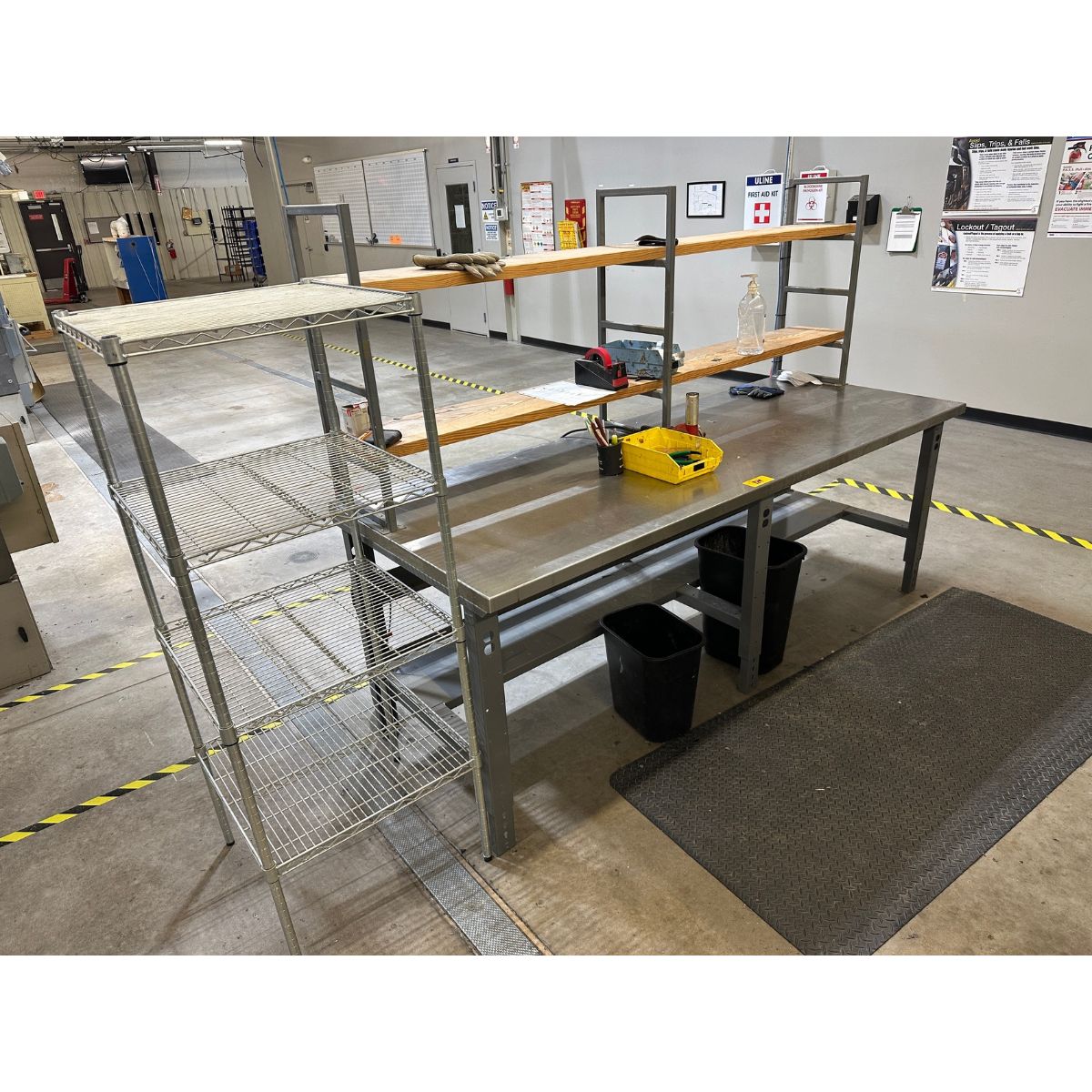 This comprehensive lot features a premium stainless steel topped table with integrated welded 1′ shelves, complemented by a versatile wire shelving unit. Originally sourced from a late model CNC router and media printing facility, this equipment represents exceptional value for businesses seeking durable storage and workspace solutions.