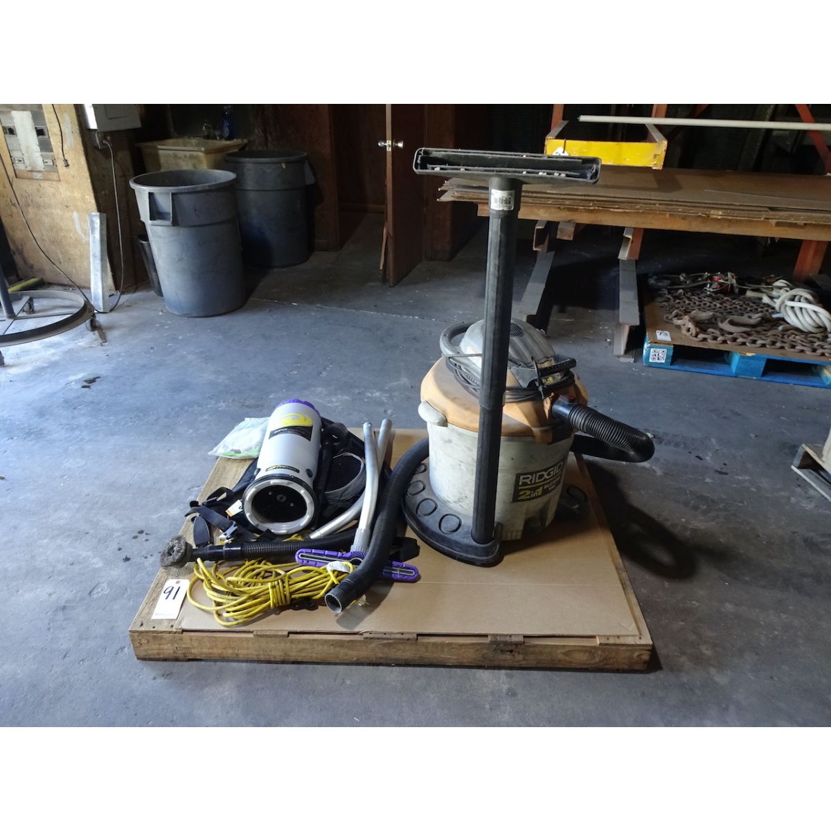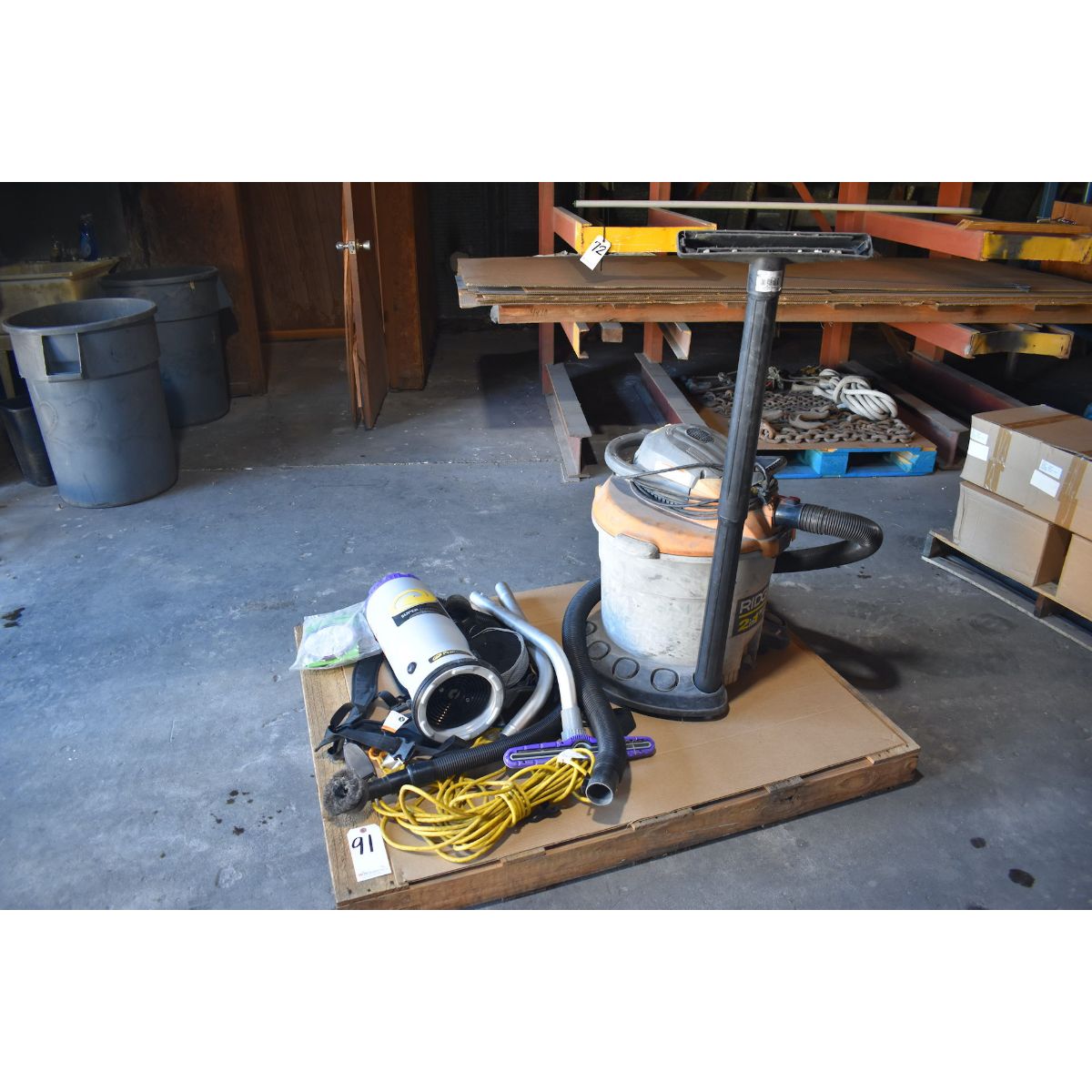 Professional-grade cleaning equipment lot featuring the ProTeam Super QuarterVac backpack vacuum with HEPA filtration and a versatile Rigid 2-in-1 blower/shop vacuum combination. This comprehensive cleaning solution is ideal for commercial cleaning contractors, facility maintenance teams, and industrial applications requiring efficient dust and debris removal.