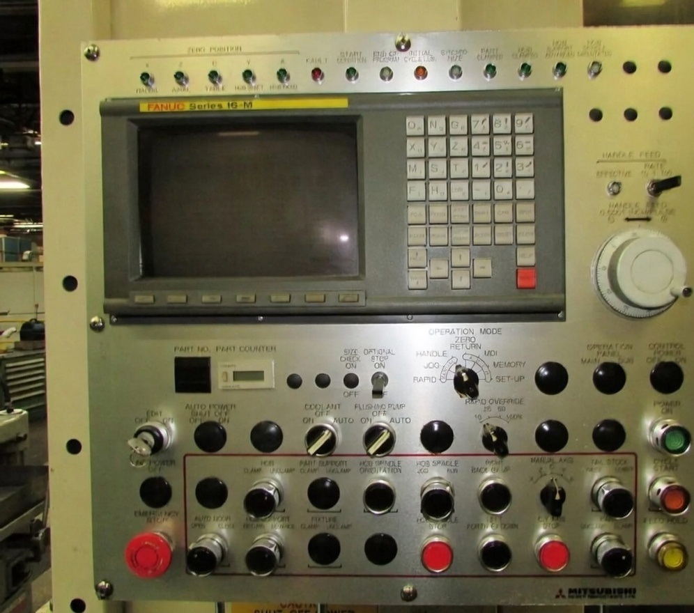 Mitsubishi Model GC-20 5-Axis CNC Gear Hobber, Fanuc 16M CNC Control, C-Axis, 7.9 x 27.6 Maximum Work Piece, 9.8 Maximum Face Width, Spindle Speeds 150-1000 rpm, Table Speeds to 100 rpm