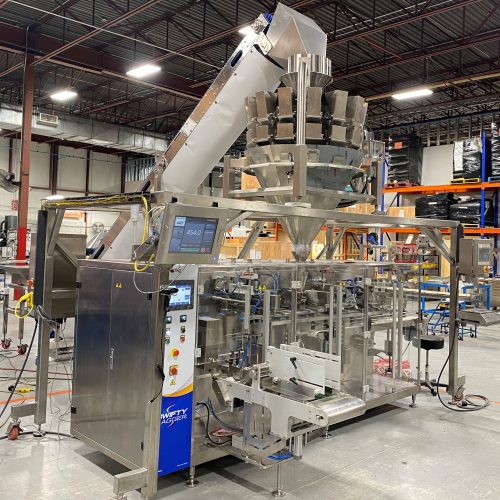 WeighPack Systems Swifty Bagger Model 1200 30 PPM Preformed Pouch Packager. Straight Line Design with Left to Right Configuration. Pouch Sizes 150 mm – 300 mm Wide. 150 mm – 450 mm Long. 40 mm Maximum Product Height. Bag Shaker at Filling Station. Includes PrimoCombi (14) Head S/S Rotary Combination Scale. 2.5 L Buckets. Star Auger 200 S/S Single Head Auger Filler. Maximum Dispense Weight of 10 Pounds. Incline Conveyor with Vibratory Feed Hopper. Screw Conveyor with Feed Hopper. Support Platform and Stands. 230 V, 3 Ph, 60 Hz.