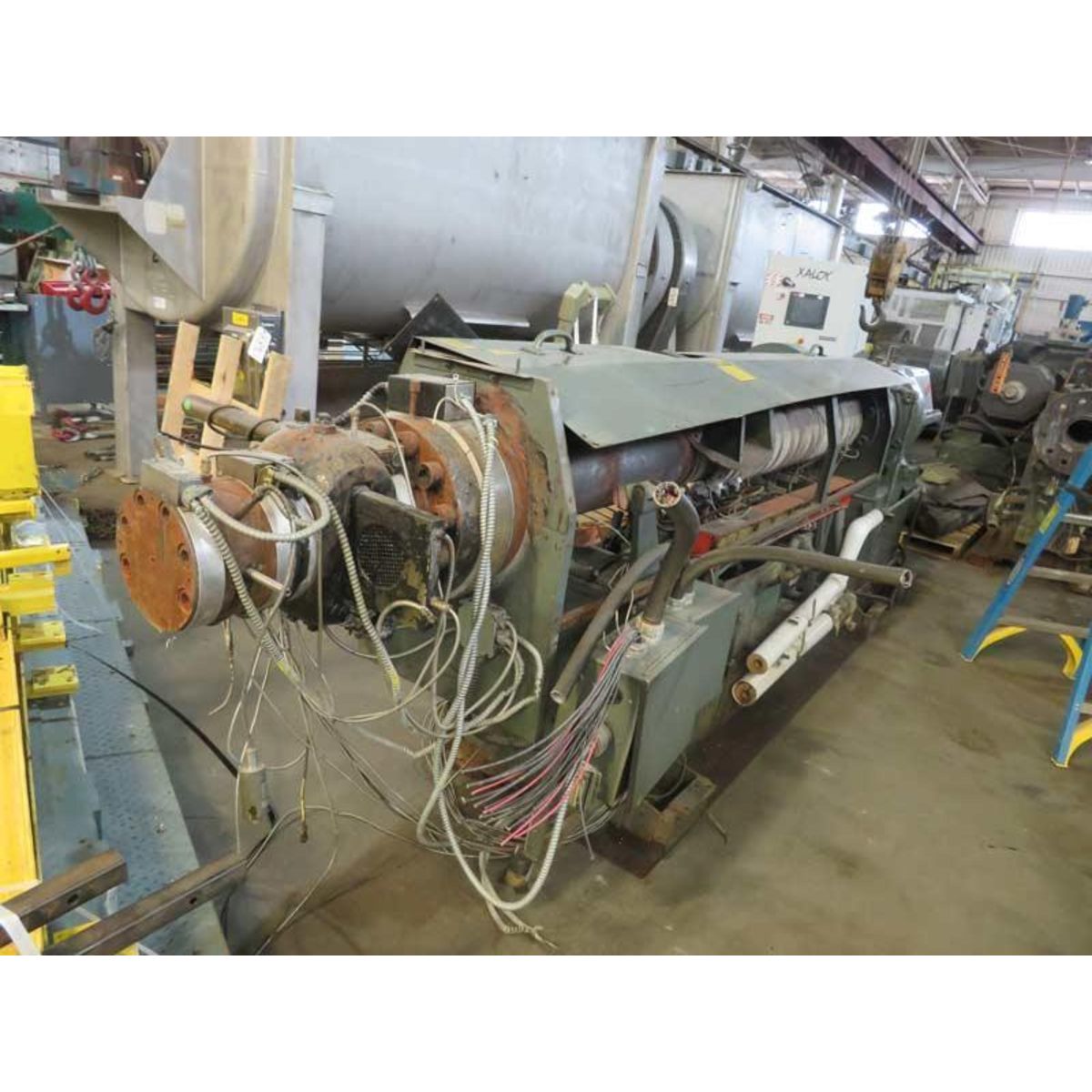 3.5" 32:1 L/D EGAN EXTRUDER, 150HP3.5″ 32:1 L/DEGAN EXTRUDERELECTRICALLY HEATEDWATER COOLED (CLOSED LOOP)TOP VENTEDPLUGGED BARREL AT AN APPROXIMATE 52″ CENTER LINE HEIGHT.-GEARBOX: REDUCTION RATIO OF 7:1 IS-BELT DRIVEN-150 HP D/C MOTOR-3½” DIAMETER ROUND ON CENTER FEED THROAT ENTRANCE BERINGER 4.5″-MODEL 17 SCREEN CHANGER-LESS HYDRAULIC CYLINDER MOUNTED ON THE EXTRUDER DISCHARGEAll specifications are assumed to be correct but must be confirmed by the purchasing entity.Item Location - Elk Grove Village, IL