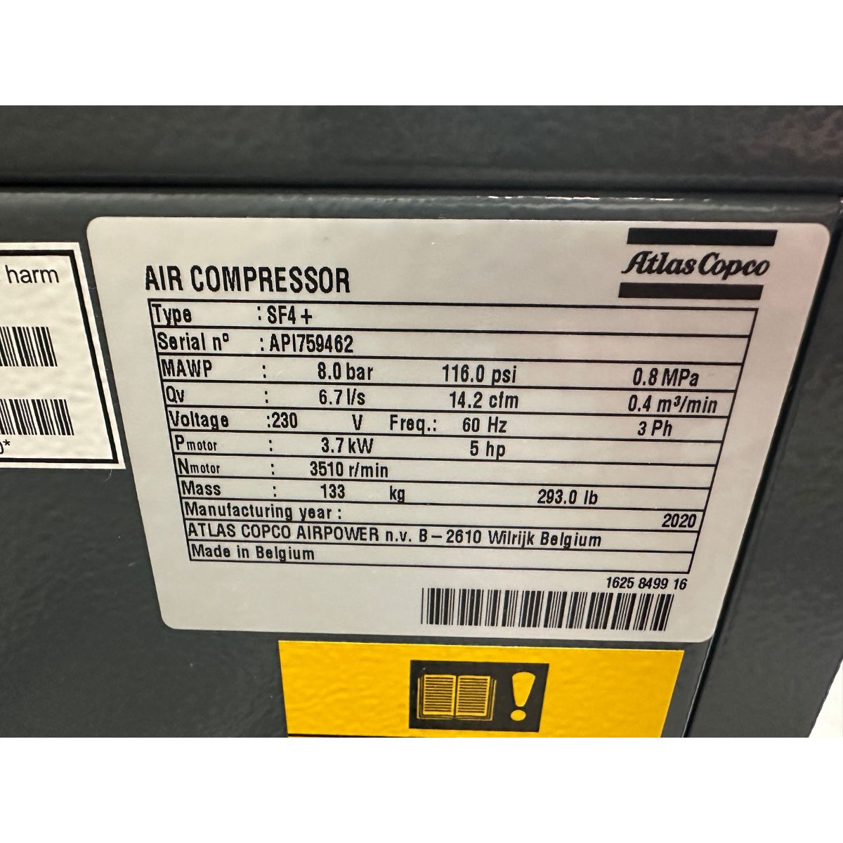 2020 Atlas Copco SF4+ Oil Free Air Compressor - S/N API759462 | Required Rigging and Loading Fee for Simple Loading: $375