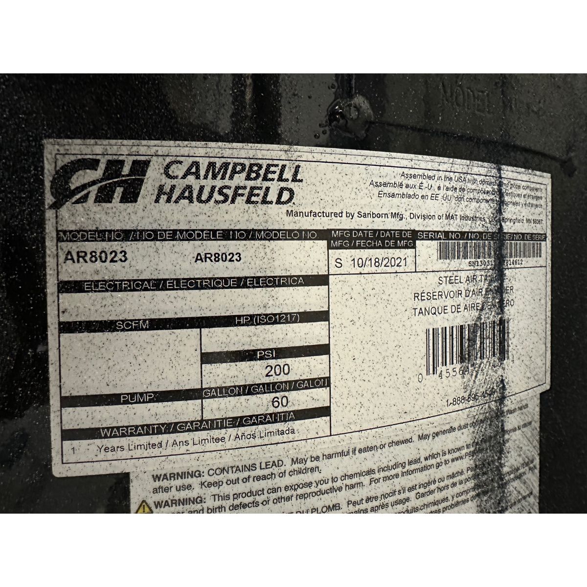 Campbell Hausfeld 60 Gallon Compressed Air Holding Tank | Required Rigging and Loading Fee for Simple Loading: $125