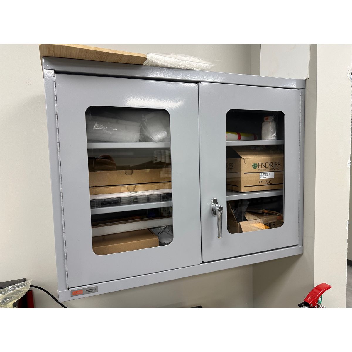 Lot of Stainless Steel Topped Table with File Cabinet, Wall Cabinet, Shelving Units and Contents | Required Rigging and Loading Fee for Simple Loading: $100